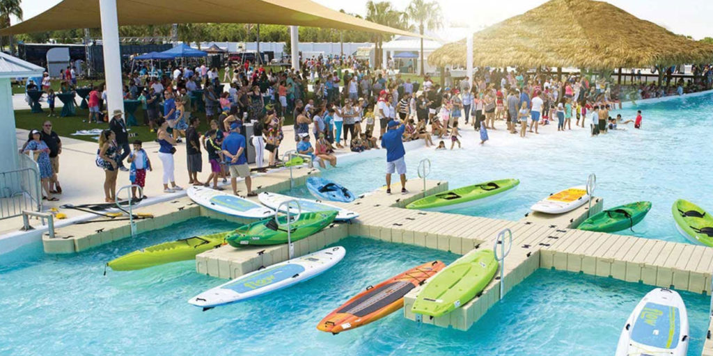 What community swimming pool do you know of that sports an aquatic obstacle course, paddleboard and kayak rentals, a swim-up tiki bar, an event stage, wading areas for little ones, cabanas and beaches – all presented together in a 5-acre pleasure park in sun-drenched Florida?